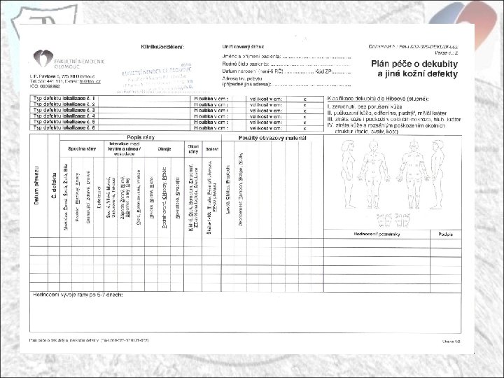 Ošetřovatelská dokumentace Vedení ošetřovatelské dokumentace je nedílnou součástí zdravotnické dokumentace. - hodnocení naplánované péče, dosažení požadovaného cíle - komplexní hodnocení realizace naplánovaných intervencí - flexibilní, pravidelná evaluace ošetřovatelského plánu, reakce na změny potřeb pacienta - provádění jednotlivých intervencí dle ordinace lékaře (zaznamenávání přesných časů plnění ordinací) - dokumentace specifických problémů (péče o chronické rány, prevence a terapie dekubitů, hodnocení bolesti dle VAS, dialyzační protokol) do příslušných standardizovaných protokolů Nutná identifikace osob (podpis, razítko) pořizujících záznam do dokumentace, časový interval péče o konkrétního pacienta !!!!