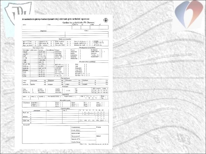 Anesteziologická péče Informovaný souhlas pacienta s anestezií Identifikace pacienta Předanestetické vyšetření dle doporučení, anamnéza pacienta Záznam o ordinované a aplikované premedikaci Stanovení rizika pacienta a typ použité anestezie Záznam o užití invazivních vstupů, charakteristika (ETK, CVK, AK), lokalizace velikost, zvláštní charakter Monitorování vitálních funkcí během anestezie Aplikovaná farmaka, krevní deriváty, infuzní roztoky, provedená perioperační vyšetření Stav pacienta při propouštění z operačního sálu Doporučení překladu pacienta – JIP, dospávací pokoj, standardní oddělení Doporučení monitorace pacienta v postanestetickém období, analgezie Identifikace a podpis anesteziologa a anesteziologické sestry Záznam o sledování pacienta po ukončení anestezie dle ordinace lékaře podávajícího anestezii