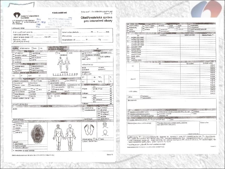 Obsah zdravotnické dokumentace Příjem pacienta k ústavnímu léčení je podmíněn vystavením přijímacího protokolu, který obsahuje: - podrobnou anamnézu, dle jednotlivých odborností (OA, RA, SA, PA, FA, …) - zhodnocení nynějších obtíží, identifikace bolesti - zhodnocení případných předchozích klinických a paraklinických vyšetření - objektivní fyzikální vyšetření dle odbornosti – komplexní zhodnocení - diagnostickou rozvahu (pracovní diagnóza) - užití škálovacích a skórovacích systémů pro hodnocení stávajícího stavu, prognostických markerů (nutriční dotazník, Euro. Score, APACHE I, II, SOFA, NYHA, CCS, Killip…) - stanovení potřeb zdravotní péče v biopsychosociální – plán péče - edukaci/informování pacienta (současný léčebný režim, průběh hospitalizace. . ) - datum, čas vystavení přijímacího protokolu, datum a čas přijetí k hospitalizaci, identifikace lékaře vystavujícího přijímací protokol