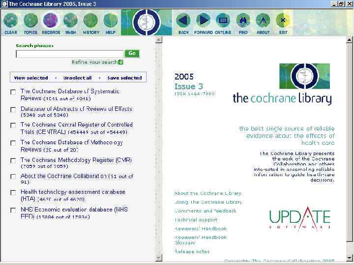 Электронные ресурсы Clinical Evidence – Доказательная медицина. Ежегодный справочник The Cochrane Collaboration Library Информационная система Up. To. Date – электронная медицинская энциклопедия на 2 -х компакт-дисках, обновляется 4 раза в год, более 40 тысяч страниц