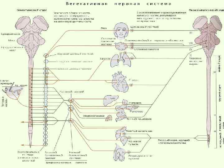 Вегетативная нервная система: • Симпатическая • Парасимпатическая • Метасимпатическая (собственная нервная система кишечника, обеспечивающая его перистальтику)