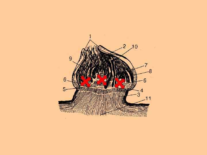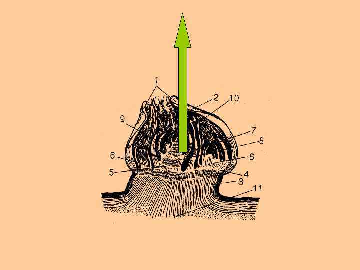 1. Кроющие чешуи 2. Волоски 3. Подушечка 4. Подстилающий слой 5. Главная почка 6. Замещающие почки 7. Зачаточный узел 8. Зачаточное междоузлие 9. Зачаточное соцветие 10. Конус нарастания гл. почки 11. Диафрагма