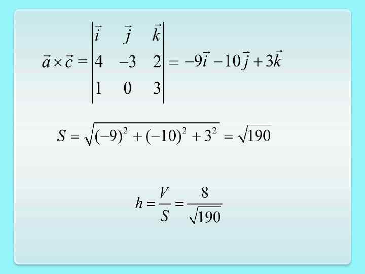 Пример. Параллелепипед построен на векторах Найти длину высоты, опущенной из конца вектора на плоскость векторов и h