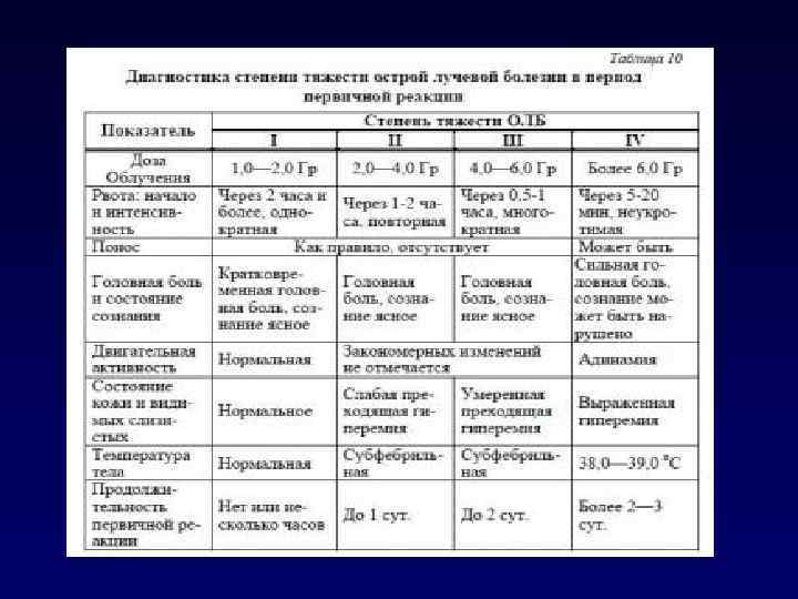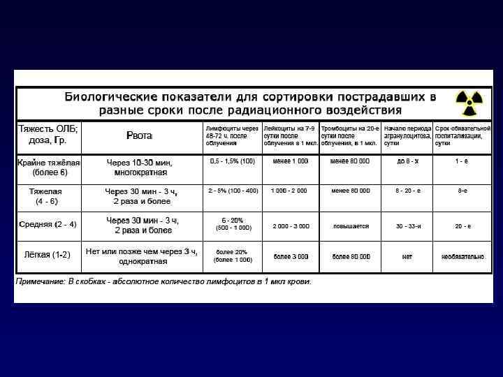 Клиническая картина • В момент облучения в дозе 500 - 1000 рад человек голубоватый свет радиоактивного источника, ощущает исходящее от него слабое тепло. Уже в первые минуты и часы появляются симптомы, обусловленные распадом облучённых тканей и выходом в кровь из клеток белков, ферментов, биологически активных веществ - кининов, гистамина, серотонина и др. У больных бывают тошнота, рвота, головная боль, слабость; может повыситься температура. Сумма этих признаков составляет первичную реакцию на облучение. Чем больше доза облучения, тем раньше возникают эти симптомы. Так, при дозах 100 - 200 рад (лёгкая степень лучевой болезни) отмечается однократная рвота через 3 часа после воздействия; при дозах более 600 рад рвота многократная и возникает уже через 10 - 15 минут. При сверхвысоких дозах (более 1000 рад) выражена резчайшая слабость, отмечаются боли в животе, неукротимая рвота, отёк головного мозга, падение артериального давления, нейтрофильный лейкоцитоз.