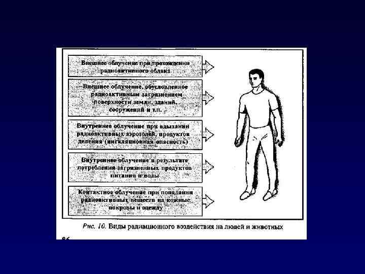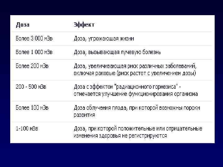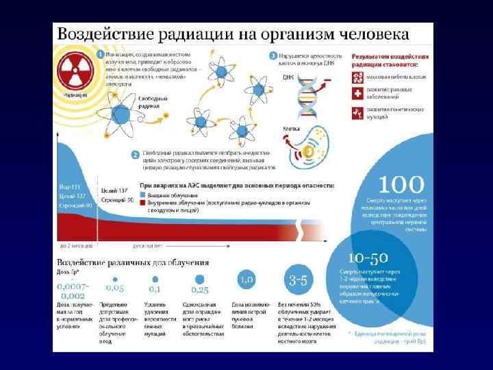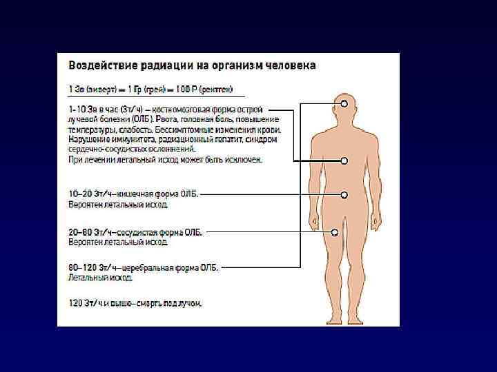 Клиника - доза • В случае облучения 50 -100 Гр поражение ЦНС определяет ведущую роль в механизме развития заболевания. При этой форме болезни смерть отмечается, как правило, на 4 -8 -й день после воздействия радиации • При облучении в дозах от 10 до 50 Гр на первый план в механизме развития выходят симптомы поражения желудочно-кишечного тракта с отторжением слизистой тонкого кишечника, приводящие к смерти в течение 2 недель • Под влиянием меньшей дозы облучения (от 1 до 10 Гр) четко прослеживаются симптомы, типичные для острой лучевой болезни, главным проявлением которой является гематологический синдром, сопровождающийся кровотечениями и всевозможными осложнениями инфекционной природы. • Повреждение органов желудочно-кишечного тракта, различных структур как головного, так и спинного мозга, а также органов кроветворения является характерным для воздействия вышеуказанных доз облучения. Степень выраженности таких изменений и быстрота развития нарушений зависят от количественных параметров облучения.