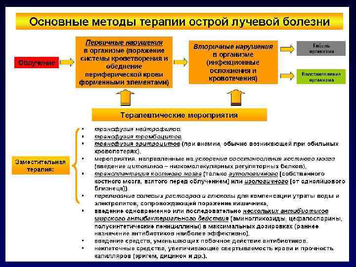 Клиника - доза • Основные проявления острой лучевой болезни определяются поражением кроветворения с развитием аплазии костного мозга и обусловленными цитопенией осложнениями: – геморрагическим синдромом, инфекционными поражениями органов, сепсисом; – нарушением физиологической репродукции эпителия тонкой кишки с обнажением слизистой оболочки, потерей белка, жидкости и электролитов; – тяжелой интоксикацией вследствие массивной деструкции радиочувствительных тканей (костного мозга, тонкой кишки, а также кожи — при обширном поражении слабопроникающим внешним бета-излучением); – непосредственным поражением ЦНС с нарушением ее функций, особенно центральной регуляции кровообращения и дыхания. • В соответствии с этим выделяют костномозговую, кишечную, токсемическую, нервно-церебральную и переходные между ними формы острой лучевой болезни