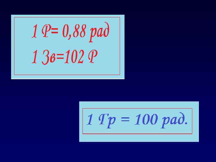Единицы измерения • Рад - единица поглощенной дозы излучения, равная энергии 100 эрг, поглощенной 1 г облученного вещества • Рентген (Р) - единица экспозиционной дозы облучения, соответствующая дозе рентгеновского или гаммаизлучения, под действием которого в 1 см 3 сухого воздуха в нормальных условиях (температура 0°С, давление 760 мм рт. ст. ) создаются ионы, несущие одну электростатическую единицу количества электричества каждого знака • Бэр - биологический эквивалент рада • Грей (Гр)=100 рад