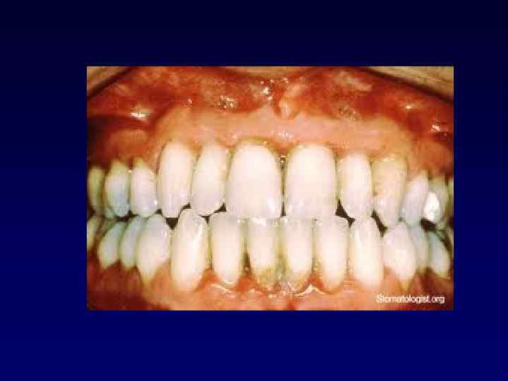 Оральный синдром: клиника, течение • При облучении слизистой оболочки рта в дозе выше 500 рад развивается так называемый оральный синдром: отек слизистой оболочки рта в первые часы после облучения, кратковременный период ослабления отека и вновь его усиление, начиная с 3 -4 -го дня; сухость во рту, нарушение слюноотделения, появление вязкой, провоцирующей рвоту слюны; развитие язв на слизистой оболочке рта. Все эти изменения обусловлены местным лучевым поражением, они первичны. Их возникновение обычно предшествует агранулоцитозу, который может усугублять инфицированность оральных поражений. • Оральный синдром протекает волнообразно с постепенным ослаблением тяжести рецидивов, затягиваясь иногда на 1, 5 -2 мес. Начиная со 2 -й недели после поражения при дозах облучения менее 500 рад, отек слизистой оболочки рта сменяется появлением плотно сидящих белесых налетов на деснах-гиперкератозом, внешне напоминающим молочницу. В отличие от нее эти налеты не снимаются; в дифференцировке помогает и микроскопический анализ отпечатка с налета, не обнаруживающий мицелия гриба. Язвенный стоматит развивается при облучении слизистой оболочки рта в дозе выше 1000 рад. Его продолжительность около 1 -1, 5 мес. Восстановление слизистой практически полное; при облучении слюнных желез в дозе выше 1000 рад возможно стойкое выключение саливации.