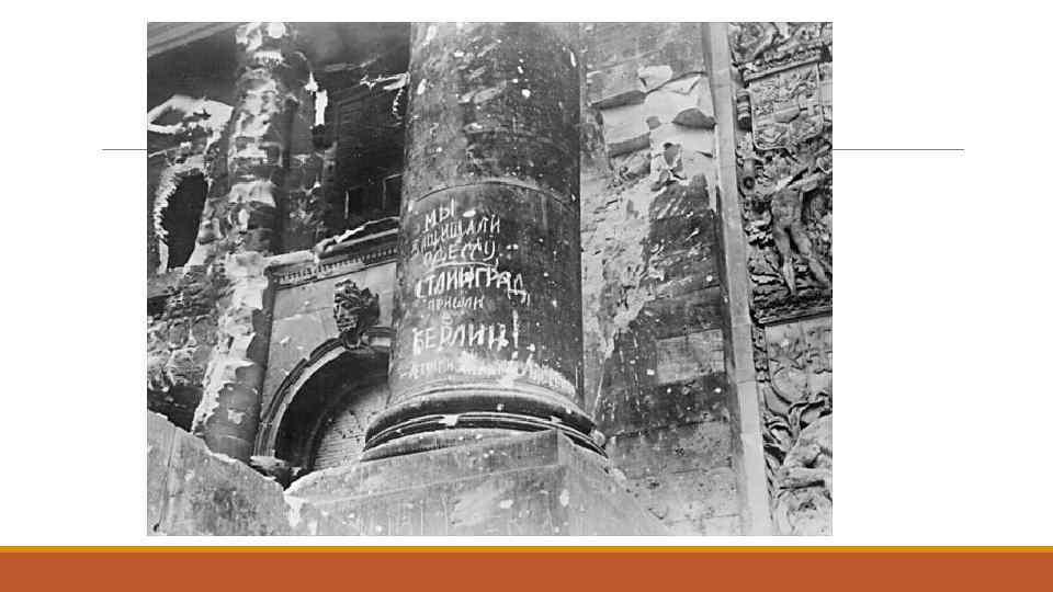 Этапы: v Первый этап: 22 июня 1941 – 19 ноября 1942 гг. Нападение Германии на СССР, отступление советской армии, провал блицкрига. v. Второй этап: 17 ноября 1942 г. – декабрь 1943 г. Коренной перелом в ходе войны, переход стратегической инициативы к советской армии. v. Третий этап: 1944 г. – 9 мая 1945 г. Освобождение от фашистов территории СССР, освобождение Европы, взятие Берлина и безоговорочная капитуляция фашистской Германии.