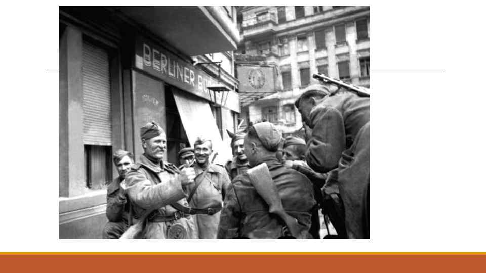1945 год 17 января – Освобождение столицы Польши Варшавы. 4 – 11 февраля – Крымская конференция руководителей антифашисткой коалиции. 13 апреля – взятие столицы Австрии Вены. 16 апреля – 8 мая – Берлинская операция войск Красной Армии. 2 мая – капитуляция немецко-фашистских войск, окруженных в Берлине. 8 мая – Подписание Акта о безоговорочной капитуляции Германии. 9 мая – День ПОБЕДЫ. 9 мая – Освобождение столицы Чехословакии Праги. 24 июня – Парад ПОБЕДЫ в Москве. 26 июня – Создание Организации Объединенных Наций. 2 сентября – Подписание Акта о капитуляции Японии. 20 ноября 1945 года – 1 октября 1946 года – Нюрнбергский процесс над главными военными преступниками Германии.