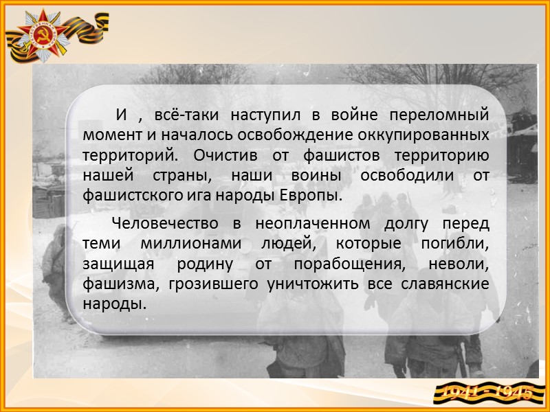 Война – это 4 года, это 1 418 бессонных дней и ночей, это 20 миллионов погибших русских людей, это значит 22 человека на каждые 2 метра земли, это значит 13 человек в каждую минуту. Война… Это бесстрашие защитников Бреста, это 900 дней блокадного Ленинграда, это клятва панфиловцев: «Ни шагу назад, за нами Москва!» Это добытая огнем и кровью победа под Сталинградом, это подвиг героев Курской дуги, это штурм Берлина, это память сердца всего народа.