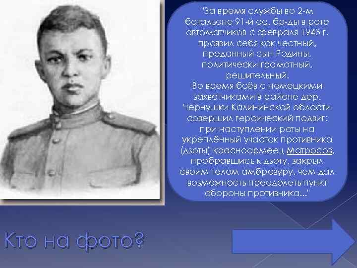 "За время службы во 2 -м батальоне 91 -й ос. бр-ды в роте автоматчиков с февраля 1943 г. проявил себя как честный, преданный сын Родины, политически грамотный, решительный. Во время боёв с немецкими захватчиками в районе дер. Чернушки Калининской области совершил героический подвиг: при наступлении роты на укреплённый участок противника (дзоты) красноармеец Матросов, пробравшись к дзоту, закрыл своим телом амбразуру, чем дал возможность преодолеть пункт обороны противника. . . " Кто на фото?