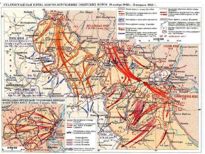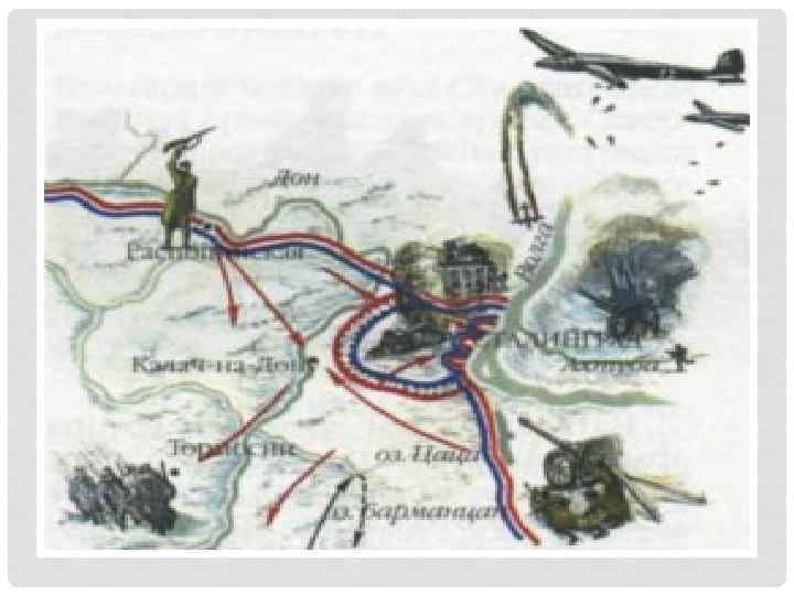 КОНТРНАСТУПЛЕНИЕ КРАСНОЙ АРМИИ ПОД СТАЛИНГРАДОМ • Войска трех фронтов нанесли удар по фланговым группировкам противника, состоявшим из сравнительно слабых итальянских и румынских войск, и прорвали вражеские позиции. • 23 ноября 1942 г. в районе Калача-на-Дону советские войска замкнули кольцо окружения, в которое попала вражеская группировка ( 6 -ая армия Ф. Паулюса, 4 -ая танковая армия - 22 дивизии, 330 тысяч человек).