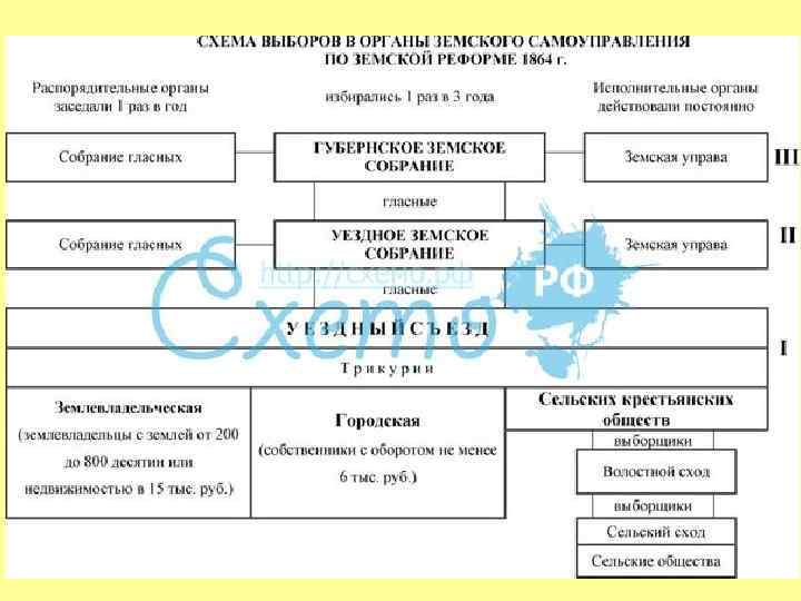 Земская реформа Вмешиваться в политические дела земствам запрещалось. Земства были органами общественного самоуправления, а не государственной власти, но в ряде случаев губернаторы утверждали решения земских органов. ? Каковы же основные принципы земской реформы? • Выборность. • Всесословность. • Финансово-хозяйственная самостоятельность. • Отделение самоуправления от администрации. • Ограничение полномочий местными хозяйственными вопросами.