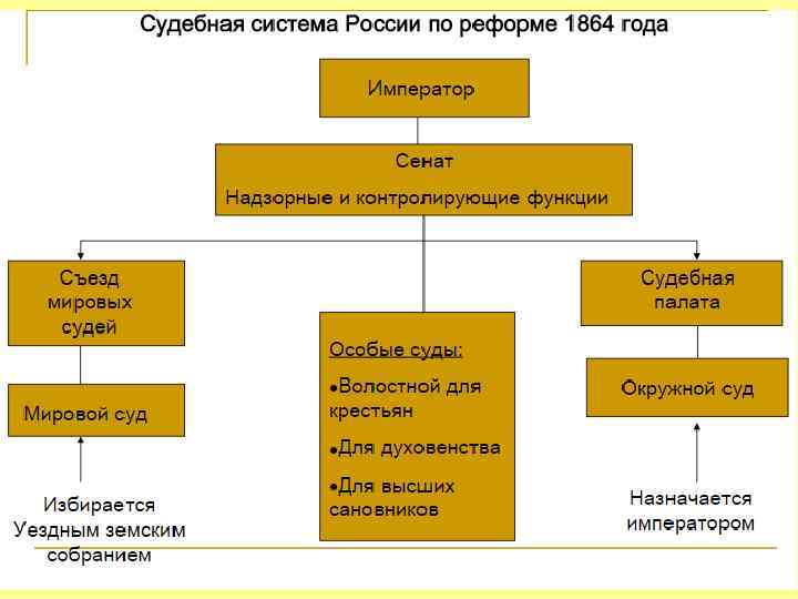 Судебная реформа Структура судебных органов Сенат Министр юстиции Обер-прокуроры кассационных департаментов Сената Уездный съезд мировых судей Мировой суд Судебная палата Прокурор судебной палаты Окружной суд Окружной прокурор