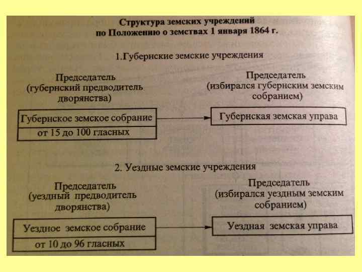 • Председателем уездного и губернского земских собраний становились уездный и губернский предводитель дворянства. • Председатели управ избирались на земских собраниях, при этом председателя уездной управы утверждал в должности губернатор, а губернской - министр внутренних дел.