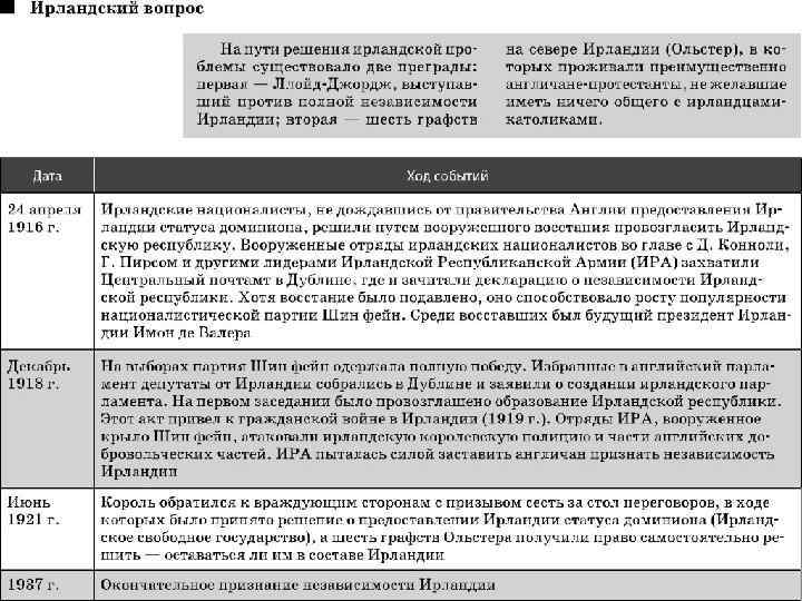В 1937 г. Дойл принял новую конституцию, по которой Ирландия провозглашалась «суверенным, независимым, демократическим государством Эйре» (гэльское название Ирландии). Главой государства объявлялся президент, который избирался по результатам всеобщего голосования. Ирландия сохранила лишь внешнюю связь с Великобританией, которая представляла ее на внешнеполитической арене.