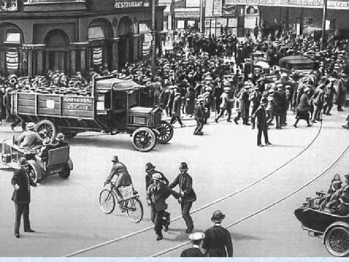 * Рост численности профсоюзов * Возникновение новых крупных тред-юнионов * Большой размах стачечной борьбы (1918 г. - более 1000 демонстраций рабочих с требованиями: -повышения заработной платы -сокращения рабочего времени -снижения цен -установления рабочего контроля над Производством • Одновременные крупные забастовки целых отраслей промышленности (горняки, машиностроители) • Акции против Английской интервенции • 1 августа 1920 г. –основание Коммунистической партии Великобритании, вошли в Коминтерн, но не смогли добиться широкой соц. поддержки