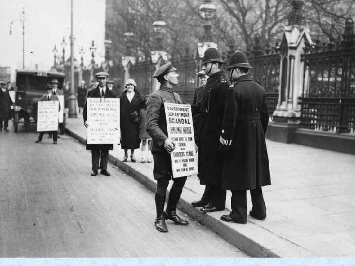 Рост безработицы ( до 17% трудоспособного населения) ужесточение условий труда предпринимателями Угольная промышленность: буржуазия объявляет о снижении з. п. и отмене трудовых соглашений шахтеры начали протестовать предприниматели объявляют локаут (1 апреля 1921 г. ) Правительство стягивает туда войска. Объявлено чрезвычайное положение. 15 апреля планировалась забастовка рабочих, но была отменена ( «Черная пятница» ) рабочим пришлось принять условия предпринимателям