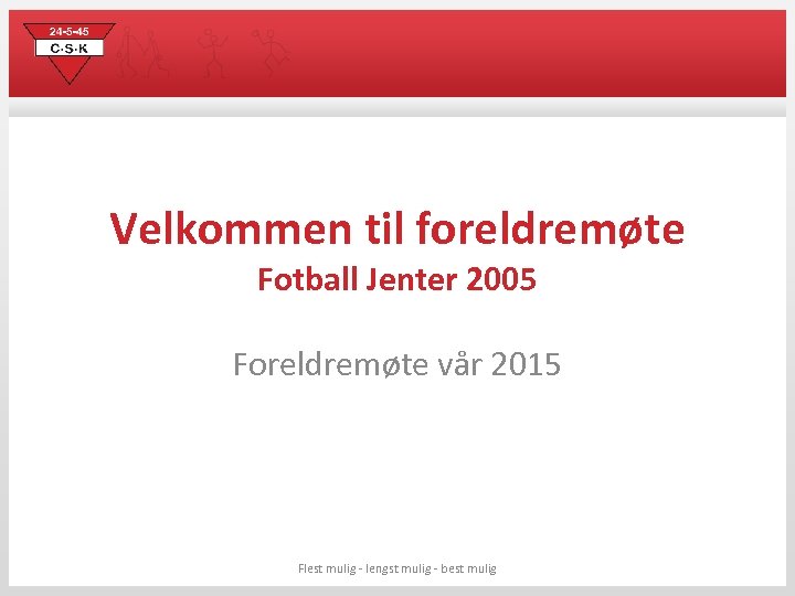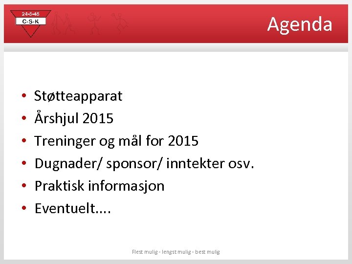 Agenda • • • Støtteapparat Årshjul 2015 Treninger og mål for 2015 Dugnader/ sponsor/ inntekter osv. Praktisk informasjon Eventuelt. . Flest mulig - lengst mulig - best mulig