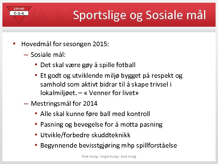 Sportslige og Sosiale mål • Hovedmål for sesongen 2015: – Sosiale mål: • Det skal være gøy å spille fotball • Et godt og utviklende miljø bygget på respekt og samhold som aktivt bidrar til å skape trivsel i lokalmiljøet. – « Venner for livet» – Mestringsmål for 2014 • Alle skal kunne føre ball med kontroll • Pasning og bevegelse for å motta pasning • Utvikle/forbedre skuddteknikk • Begynnende bevisstgjøring mhp spillforståelse Flest mulig - lengst mulig - best mulig