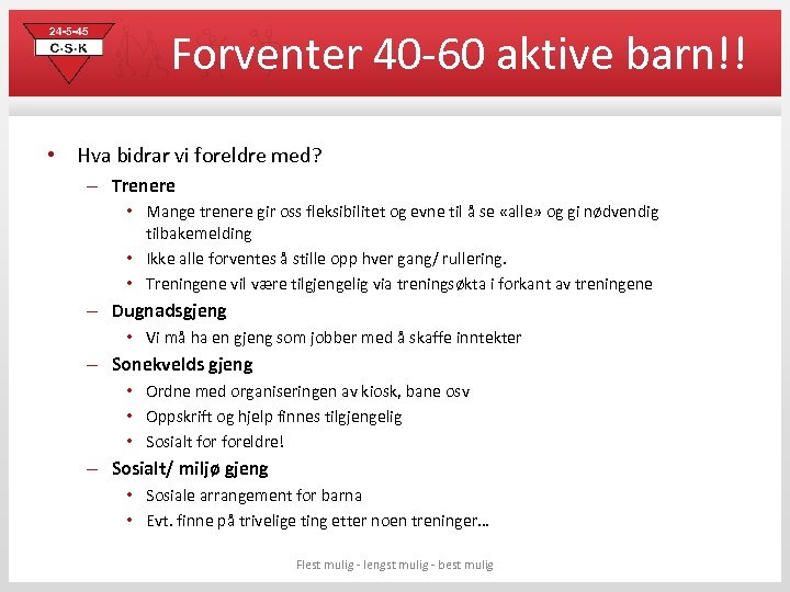 Forventer 40 -60 aktive barn!! • Hva bidrar vi foreldre med? – Trenere • Mange trenere gir oss fleksibilitet og evne til å se «alle» og gi nødvendig tilbakemelding • Ikke alle forventes å stille opp hver gang/ rullering. • Treningene vil være tilgjengelig via treningsøkta i forkant av treningene – Dugnadsgjeng • Vi må ha en gjeng som jobber med å skaffe inntekter – Sonekvelds gjeng • Ordne med organiseringen av kiosk, bane osv • Oppskrift og hjelp finnes tilgjengelig • Sosialt foreldre! – Sosialt/ miljø gjeng • Sosiale arrangement for barna • Evt. finne på trivelige ting etter noen treninger… Flest mulig - lengst mulig - best mulig