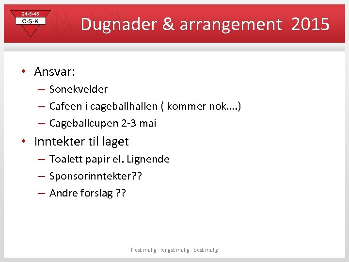 Dugnader & arrangement 2015 • Ansvar: – Sonekvelder – Cafeen i cageballhallen ( kommer nok…. ) – Cageballcupen 2 -3 mai • Inntekter til laget – Toalett papir el. Lignende – Sponsorinntekter? ? – Andre forslag ? ? Flest mulig - lengst mulig - best mulig