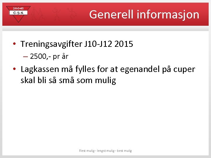 Generell informasjon • Treningsavgifter J 10 -J 12 2015 – 2500, - pr år • Lagkassen må fylles for at egenandel på cuper skal bli så små som mulig Flest mulig - lengst mulig - best mulig