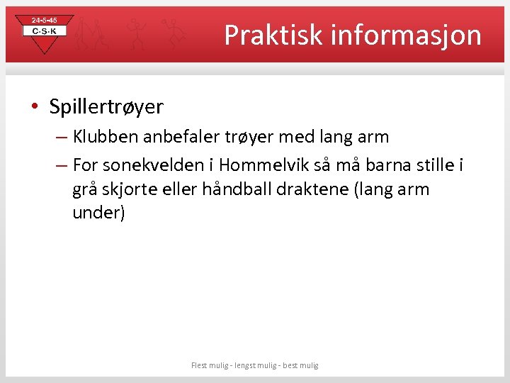 Praktisk informasjon • Spillertrøyer – Klubben anbefaler trøyer med lang arm – For sonekvelden i Hommelvik så må barna stille i grå skjorte eller håndball draktene (lang arm under) Flest mulig - lengst mulig - best mulig