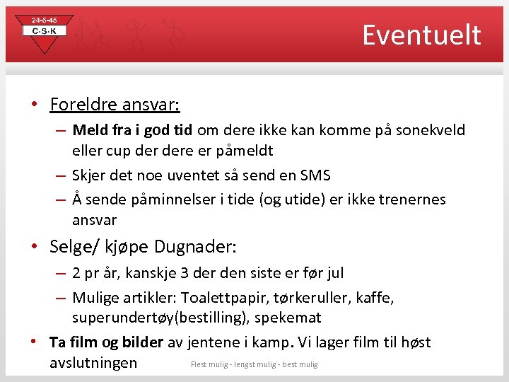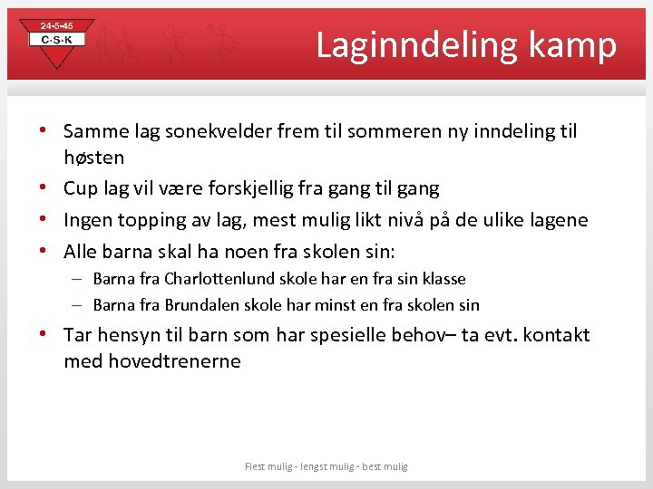 Laginndeling kamp • Samme lag sonekvelder frem til sommeren ny inndeling til høsten • Cup lag vil være forskjellig fra gang til gang • Ingen topping av lag, mest mulig likt nivå på de ulike lagene • Alle barna skal ha noen fra skolen sin: – Barna fra Charlottenlund skole har en fra sin klasse – Barna fra Brundalen skole har minst en fra skolen sin • Tar hensyn til barn som har spesielle behov– ta evt. kontakt med hovedtrenerne Flest mulig - lengst mulig - best mulig
