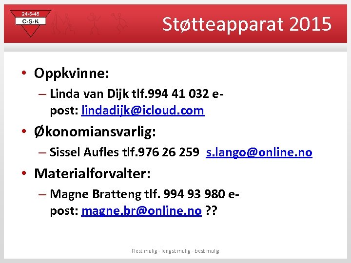Støtteapparat 2015 • Oppkvinne: – Linda van Dijk tlf. 994 41 032 epost: lindadijk@icloud. com • Økonomiansvarlig: – Sissel Aufles tlf. 976 26 259 s. lango@online. no • Materialforvalter: – Magne Bratteng tlf. 994 93 980 epost: magne. br@online. no ? ? Flest mulig - lengst mulig - best mulig
