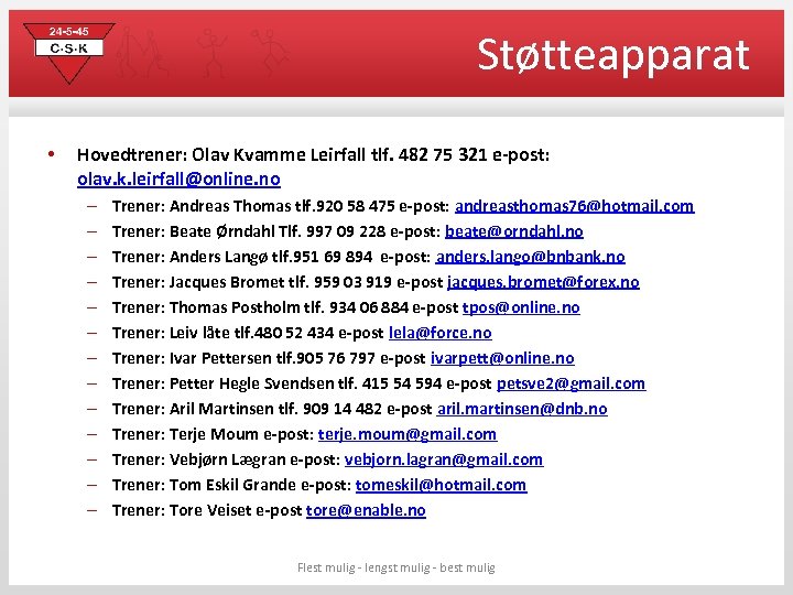 Støtteapparat • Hovedtrener: Olav Kvamme Leirfall tlf. 482 75 321 e-post: olav. k. leirfall@online. no – – – – Trener: Andreas Thomas tlf. 920 58 475 e-post: andreasthomas 76@hotmail. com Trener: Beate Ørndahl Tlf. 997 09 228 e-post: beate@orndahl. no Trener: Anders Langø tlf. 951 69 894 e-post: anders. lango@bnbank. no Trener: Jacques Bromet tlf. 959 03 919 e-post jacques. bromet@forex. no Trener: Thomas Postholm tlf. 934 06 884 e-post tpos@online. no Trener: Leiv låte tlf. 480 52 434 e-post lela@force. no Trener: Ivar Pettersen tlf. 905 76 797 e-post ivarpett@online. no Trener: Petter Hegle Svendsen tlf. 415 54 594 e-post petsve 2@gmail. com Trener: Aril Martinsen tlf. 909 14 482 e-post aril. martinsen@dnb. no Trener: Terje Moum e-post: terje. moum@gmail. com Trener: Vebjørn Lægran e-post: vebjorn. lagran@gmail. com Trener: Tom Eskil Grande e-post: tomeskil@hotmail. com Trener: Tore Veiset e-post tore@enable. no Flest mulig - lengst mulig - best mulig