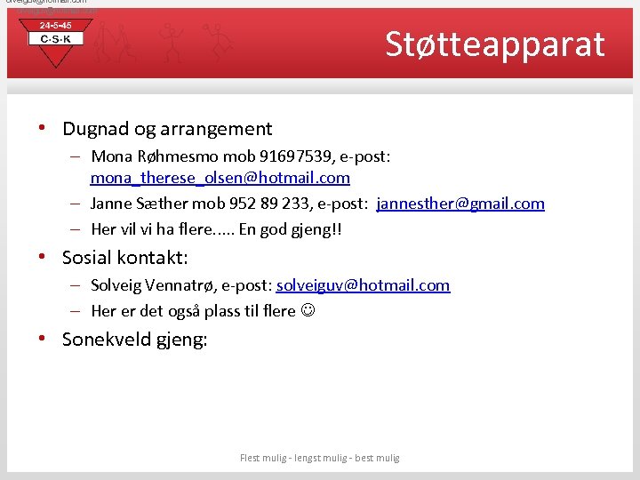 olveiguv@hotmail. com Støtteapparat • Dugnad og arrangement – Mona Røhmesmo mob 91697539, e-post: mona_therese_olsen@hotmail. com – Janne Sæther mob 952 89 233, e-post: jannesther@gmail. com – Her vil vi ha flere. . . En god gjeng!! • Sosial kontakt: – Solveig Vennatrø, e-post: solveiguv@hotmail. com – Her er det også plass til flere • Sonekveld gjeng: Flest mulig - lengst mulig - best mulig