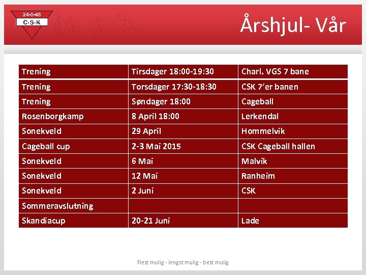 Årshjul- Vår Trening Tirsdager 18: 00 -19: 30 Charl. VGS 7 bane Trening Torsdager 17: 30 -18: 30 CSK 7’er banen Trening Søndager 18: 00 Cageball Rosenborgkamp 8 April 18: 00 Lerkendal Sonekveld 29 April Hommelvik Cageball cup 2 -3 Mai 2015 CSK Cageball hallen Sonekveld 6 Mai Malvik Sonekveld 12 Mai Ranheim Sonekveld 2 Juni CSK 20 -21 Juni Lade Sommeravslutning Skandiacup Flest mulig - lengst mulig - best mulig