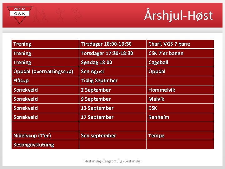 Årshjul-Høst Trening Tirsdager 18: 00 -19: 30 Charl. VGS 7 bane Trening Torsdager 17: 30 -18: 30 CSK 7’er banen Trening Søndag 18: 00 Cageball Oppdal (overnattingscup) Sen Agust Oppdal Flåcup Tidlig Septmber Sonekveld 2 September Hommelvik Sonekveld 9 September Malvik Sonekveld 13 September CSK Sonekveld 17 September Ranheim Nidelvcup (7’er) Sen september Tempe Sesongavslutning Flest mulig - lengst mulig - best mulig