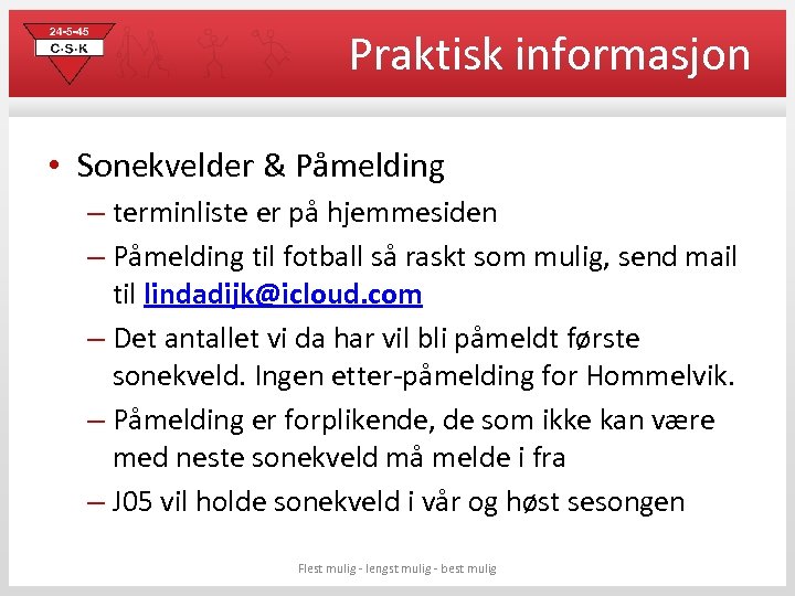 Praktisk informasjon • Sonekvelder & Påmelding – terminliste er på hjemmesiden – Påmelding til fotball så raskt som mulig, send mail til lindadijk@icloud. com – Det antallet vi da har vil bli påmeldt første sonekveld. Ingen etter-påmelding for Hommelvik. – Påmelding er forplikende, de som ikke kan være med neste sonekveld må melde i fra – J 05 vil holde sonekveld i vår og høst sesongen Flest mulig - lengst mulig - best mulig