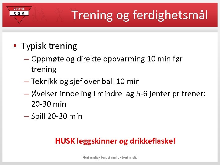 Trening og ferdighetsmål • Typisk trening – Oppmøte og direkte oppvarming 10 min før trening – Teknikk og sjef over ball 10 min – Øvelser inndeling i mindre lag 5 -6 jenter pr trener: 20 -30 min – Spill 20 -30 min HUSK leggskinner og drikkeflaske! Flest mulig - lengst mulig - best mulig