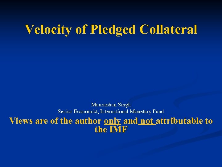 Velocity of Pledged Collateral Manmohan Singh Senior Economist, International Monetary Fund Views are of the author only and not attributable to the IMF