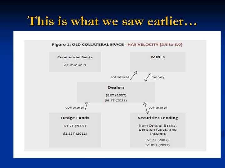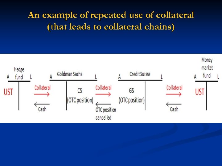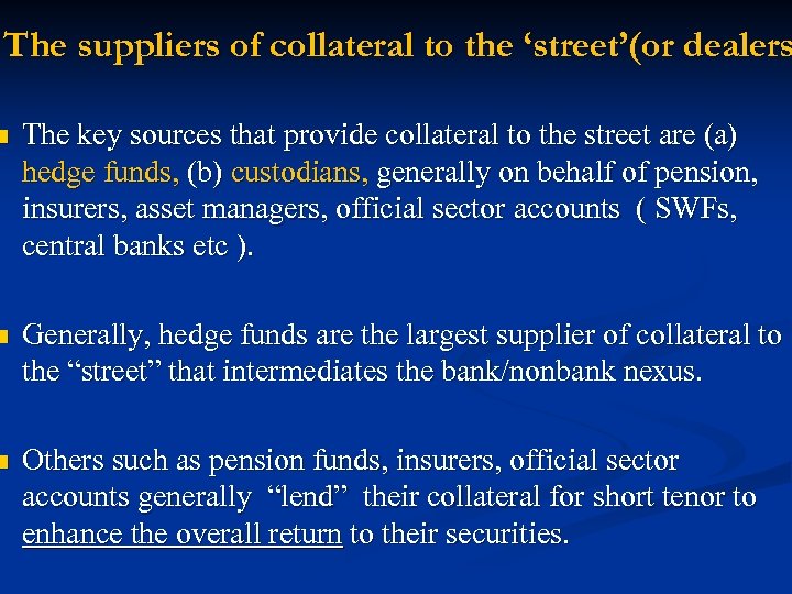 The suppliers of collateral to the ‘street’(or dealers n The key sources that provide collateral to the street are (a) hedge funds, (b) custodians, generally on behalf of pension, insurers, asset managers, official sector accounts ( SWFs, central banks etc ). n Generally, hedge funds are the largest supplier of collateral to the “street” that intermediates the bank/nonbank nexus. n Others such as pension funds, insurers, official sector accounts generally “lend” their collateral for short tenor to enhance the overall return to their securities.