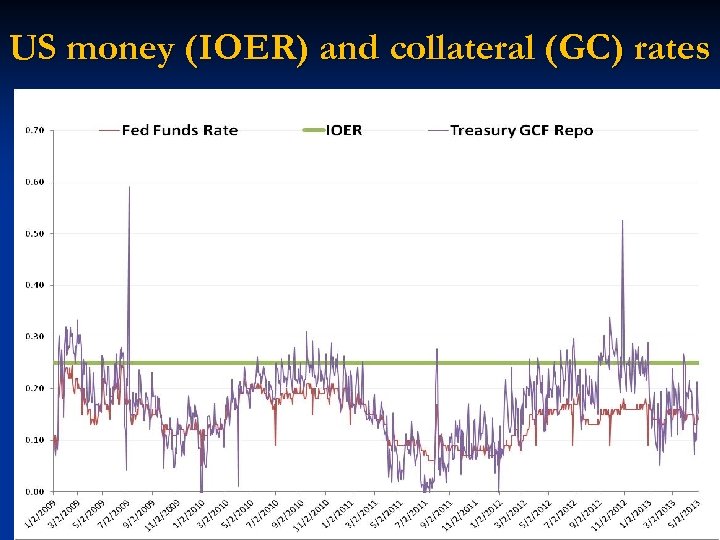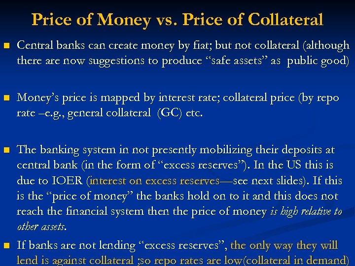 Price of Money vs. Price of Collateral n Central banks can create money by fiat; but not collateral (although there are now suggestions to produce “safe assets” as public good) n Money’s price is mapped by interest rate; collateral price (by repo rate –e. g. , general collateral (GC) etc. n The banking system in not presently mobilizing their deposits at central bank (in the form of “excess reserves”). In the US this is due to IOER (interest on excess reserves—see next slides). If this is the “price of money” the banks hold on to it and this does not reach the financial system then the price of money is high relative to other assets. If banks are not lending “excess reserves”, the only way they will lend is against collateral ; so repo rates are low(collateral in demand) n