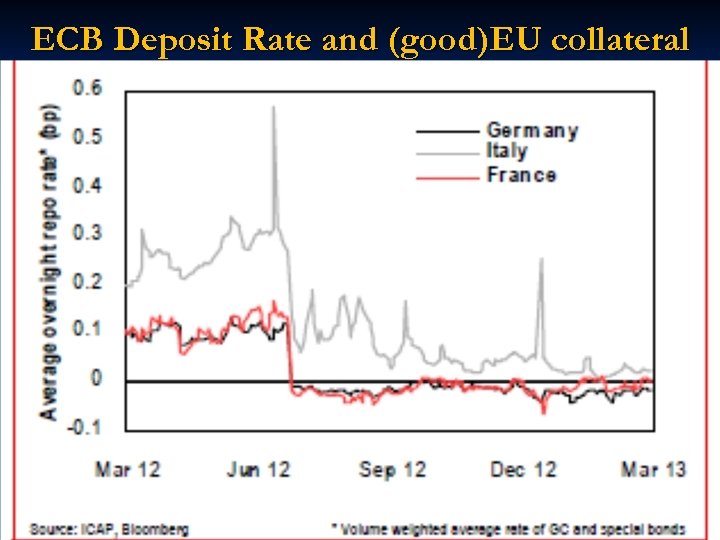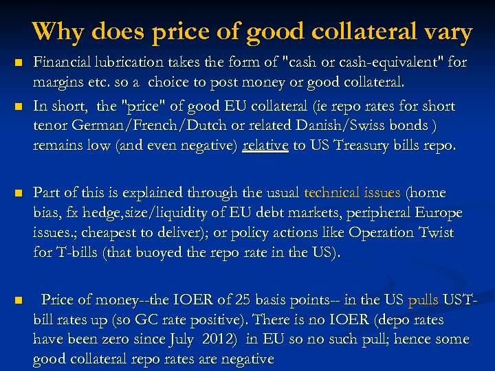 Why does price of good collateral vary n n Financial lubrication takes the form of "cash or cash-equivalent" for margins etc. so a choice to post money or good collateral. In short, the "price" of good EU collateral (ie repo rates for short tenor German/French/Dutch or related Danish/Swiss bonds ) remains low (and even negative) relative to US Treasury bills repo. n Part of this is explained through the usual technical issues (home bias, fx hedge, size/liquidity of EU debt markets, peripheral Europe issues. ; cheapest to deliver); or policy actions like Operation Twist for T-bills (that buoyed the repo rate in the US). n Price of money--the IOER of 25 basis points-- in the US pulls USTbill rates up (so GC rate positive). There is no IOER (depo rates have been zero since July 2012) in EU so no such pull; hence some good collateral repo rates are negative