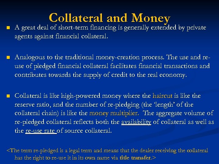 Collateral and Money n A great deal of short-term financing is generally extended by private agents against financial collateral. n Analogous to the traditional money-creation process. The use and reuse of pledged financial collateral facilitates financial transactions and contributes towards the supply of credit to the real economy. n Collateral is like high-powered money where the haircut is like the reserve ratio, and the number of re-pledging (the ‘length’ of the collateral chain) is like the money multiplier. The aggregate volume of re-pledged collateral reflects both the availability of collateral as well as the re-use rate of source collateral.