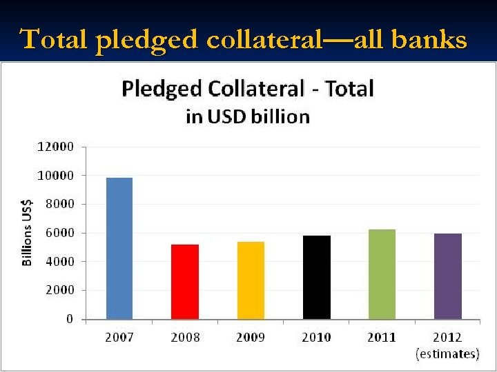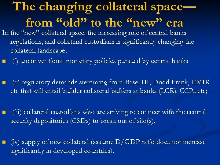 The changing collateral space— from “old” to the “new” era In the “new” collateral space, the increasing role of central banks regulations, and collateral custodians is significantly changing the collateral landscape. n (i) unconventional monetary policies pursued by central banks n (ii) regulatory demands stemming from Basel III, Dodd Frank, EMIR etc that will entail builder collateral buffers at banks (LCR), CCPs etc; n (iii) collateral custodians who are striving to connect with the central security depositories (CSDs) to break out of silo(s). n (iv) supply of new collateral (assume D/GDP ratio does not increase significantly in developed countries).