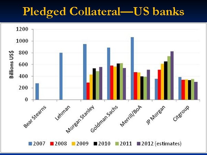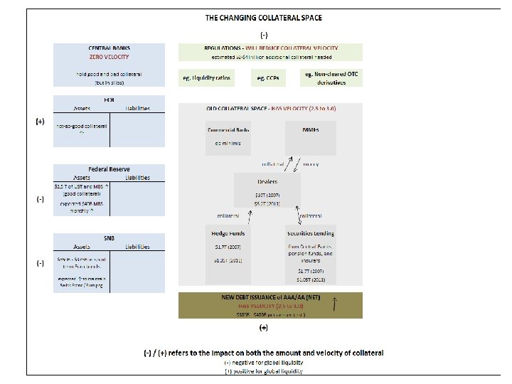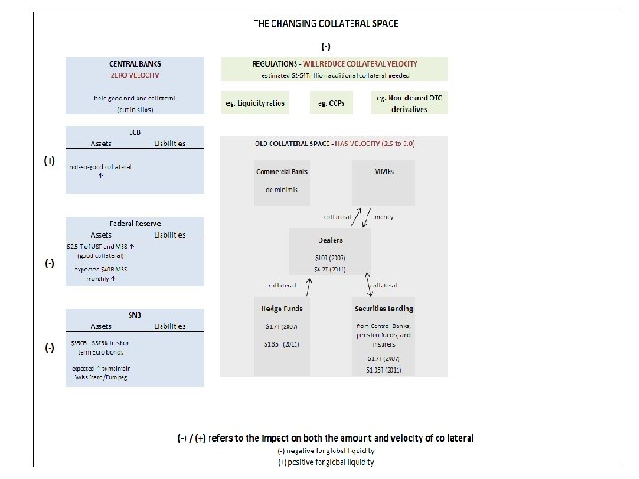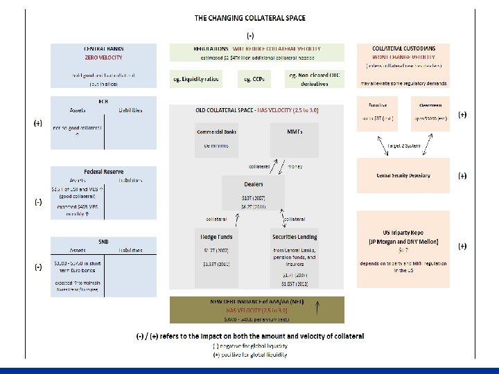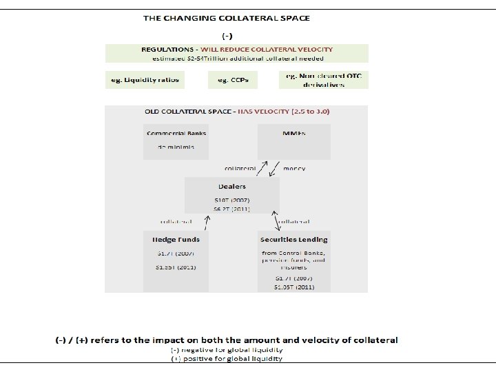 Custodians, Dealers & Collateral Silo(s) n Eurozone had € 14 trillion in collateral– (i) much of it was locked in “depositories" and thus not easily accessible for cross border use or(ii) the asymmetry of demand for collateral in ‘peripheral’ countries relative to ‘core’ countries did not make the € 14 trillion figure meaningful. n However, Euroclear and Clearstream (the key hubs for Eurozone collateral) are working with the local CSDs (or national/central security depositories) to alleviate collateral constraints. The interconnections to the CSDs will be via the Target 2 Securities (T 2 S) system that will provide a single pan-European platform for securities settlement in central bank money. n In the US, JPMorgan and Bo. NY may also improve collateral flows from within the U. S. Tri-party system; however regulatory reforms on the triparty and money market funds will play a role in this effort.