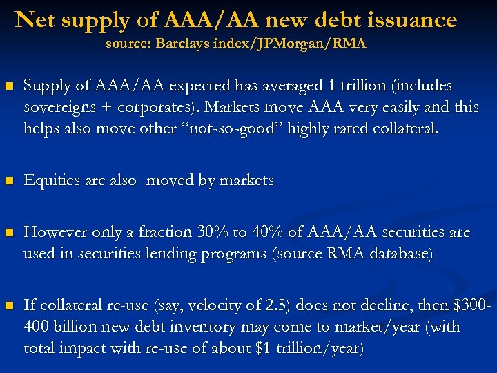 Net supply of AAA/AA new debt issuance source: Barclays index/JPMorgan/RMA n Supply of AAA/AA expected has averaged 1 trillion (includes sovereigns + corporates). Markets move AAA very easily and this helps also move other “not-so-good” highly rated collateral. n Equities are also moved by markets n However only a fraction 30% to 40% of AAA/AA securities are used in securities lending programs (source RMA database) n If collateral re-use (say, velocity of 2. 5) does not decline, then $300400 billion new debt inventory may come to market/year (with total impact with re-use of about $1 trillion/year)