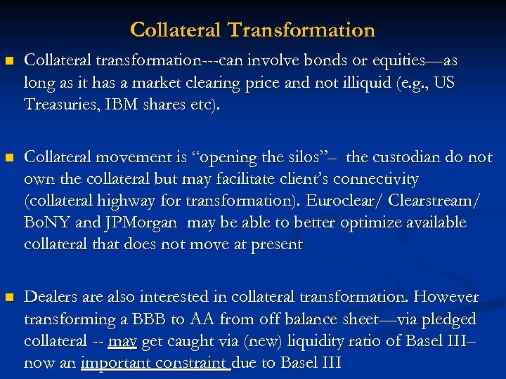 Collateral Transformation n Collateral transformation---can involve bonds or equities—as long as it has a market clearing price and not illiquid (e. g. , US Treasuries, IBM shares etc). n Collateral movement is “opening the silos”– the custodian do not own the collateral but may facilitate client’s connectivity (collateral highway for transformation). Euroclear/ Clearstream/ Bo. NY and JPMorgan may be able to better optimize available collateral that does not move at present n Dealers are also interested in collateral transformation. However transforming a BBB to AA from off balance sheet—via pledged collateral -- may get caught via (new) liquidity ratio of Basel III– now an important constraint due to Basel III