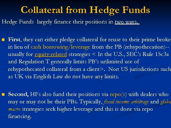 Collateral from Hedge Funds largely finance their positions in two ways. n First, they can either pledge collateral for reuse to their prime broker broke in lieu of cash borrowing/leverage from the PB (rehypothecation)-usually for equity-related strategies < In the U. S. , SEC’s Rule 15 c 3 a and Regulation T generally limits PB’s unlimited use of rehypothecated collateral from a client>. Non US jurisdictions such as UK via English Law do not have any limits. n Second, HFs also fund their positions via repo(s) with dealers who may or may not be their PBs. Typically, fixed income arbitrage and globa macro strategies seek higher leverage and this is done via repo financing.