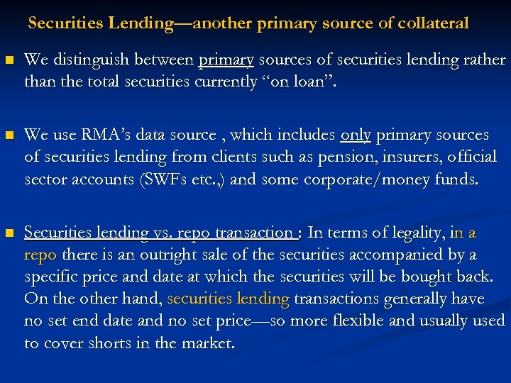 Securities Lending—another primary source of collateral n We distinguish between primary sources of securities lending rather than the total securities currently “on loan”. n We use RMA’s data source , which includes only primary sources of securities lending from clients such as pension, insurers, official sector accounts (SWFs etc. , ) and some corporate/money funds. n Securities lending vs. repo transaction : In terms of legality, in a repo there is an outright sale of the securities accompanied by a specific price and date at which the securities will be bought back. On the other hand, securities lending transactions generally have no set end date and no set price—so more flexible and usually used to cover shorts in the market.