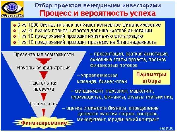 Венчурный фонд — инвестиционная компания, работающая исключительно с инновационными предприятиями и проектами (стартапами). Венчурные фонды осуществляют инвестиции в ценные бумаги или предприятия с высокой или относительно высокой степенью риска в ожидании чрезвычайно высокой прибыли. Обычно такие вложения осуществляются в сфере новейших научных разработок, высоких технологий. Как правило, 70 -80 % проектов не приносят отдачи, но прибыль от оставшихся 20 -30 % окупает все убытки.
