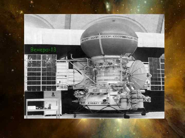 Дослідження планети за допомогою космічних апаратів Венера досить інтенсивно досліджувалася за допомогою космічних апаратів. Першим космічним апаратом, що призначалося для вивчення Венери була радянська «Венера-1» . Після спроби досягнення Венери цим апаратом, запущеним 12 лютого 1961, до планети прямували радянські апарати серії «Венера» «Вега» американські «Маринер» «Піонер-Венера-1» «Піонер -Венера-2» «Магеллан» . У 1975 космічні апарати «Венера-9» і «Венера-10» передали на Землю перші фотографії поверхні Венери; в 1982 «Венера-13» і «Венера-14» передали з поверхні Венери кольорові зображення. Втім умови на поверхні Венери такі, що жоден з космічних апаратів не пропрацював тут більше двох годин.